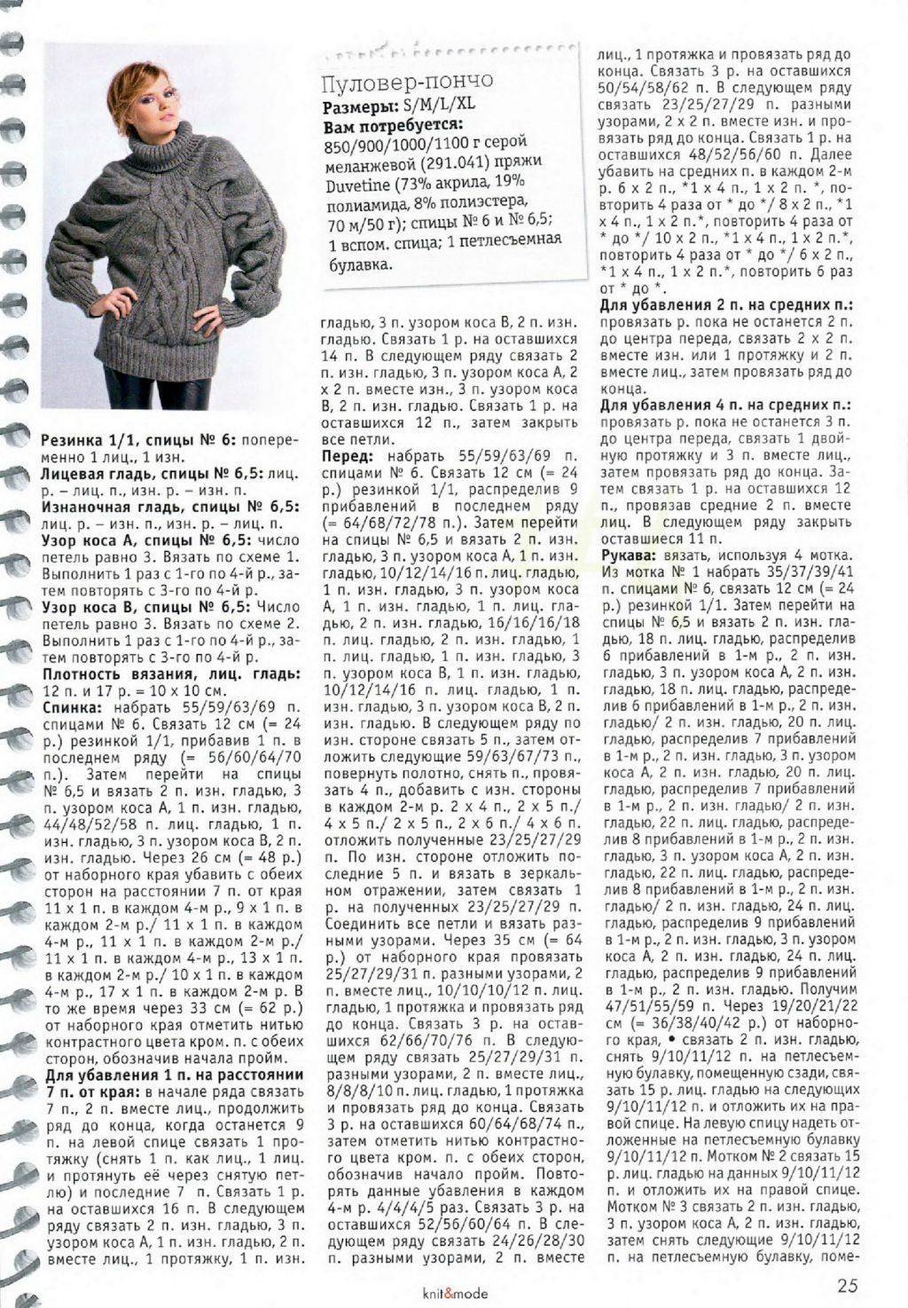 Плотность вязки составляет 10,5 п. х 13,5 р. = 10 х 10 см сотами и 8 п. х 13,5 р. = 10 х 10 см полу-патентным узором.