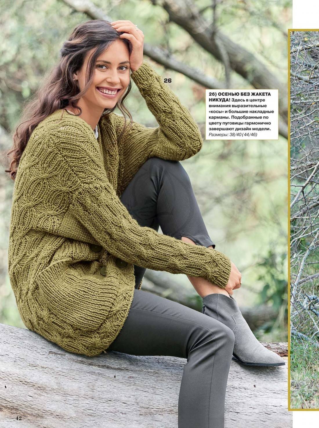 Удлиненный свитер с крупными косами и накладными карманами, красивые ажурные узоры или шикарный теплый пуловер из мохера – в актуальной оливково-шафрановой гамме данные изделия выглядят восхитительно.