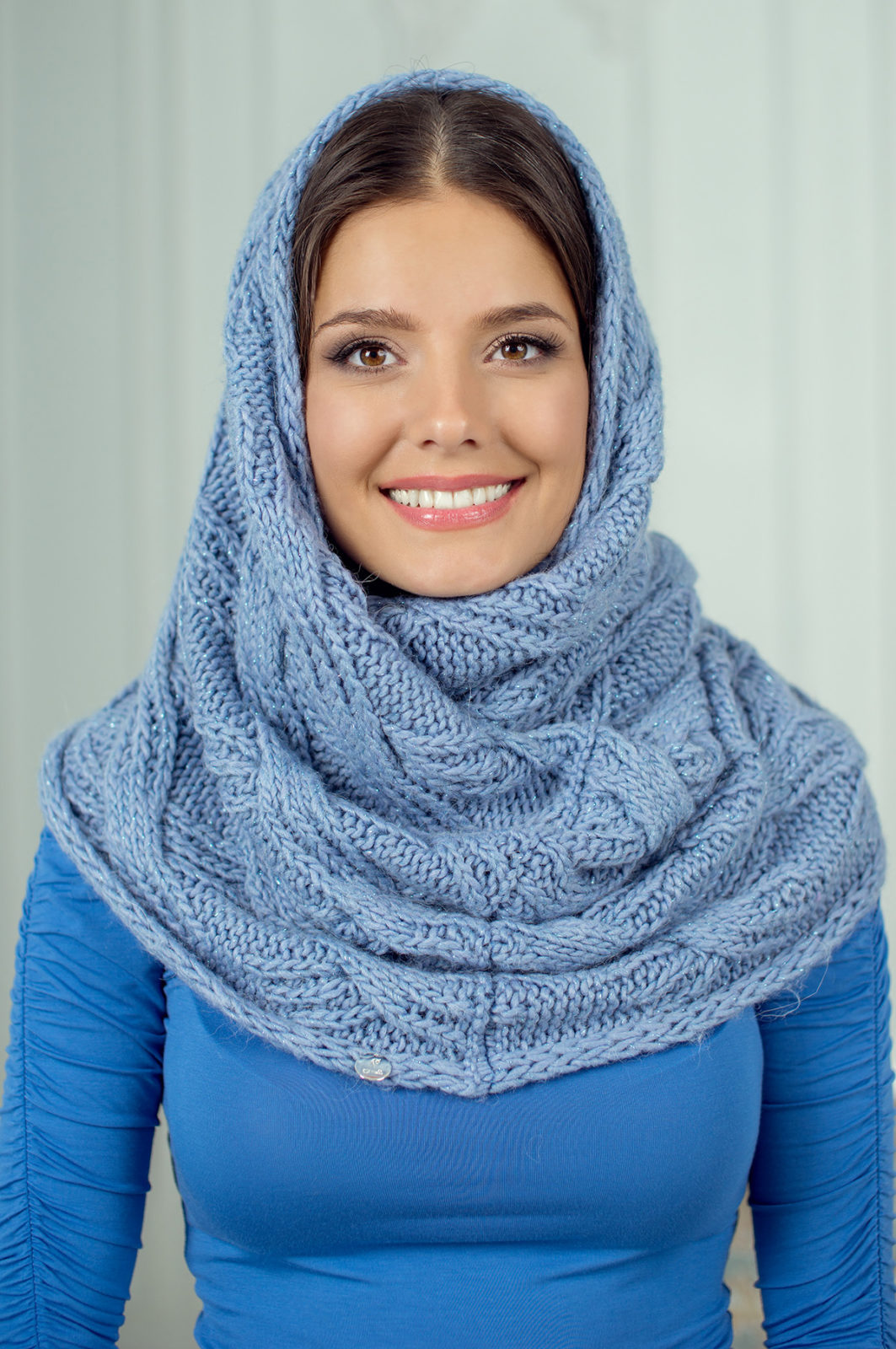 Шарф-капюшон уникален тем, что он выполняет разные функции. Он защищает от ветра и холода, не портит прическу, сберегает макияж при дожде, снегопаде. Такой шарф любой наряд сделает стильным.