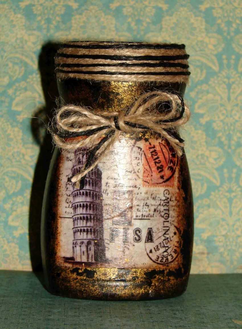 Существуют декупажные салфетки на самые разные тематики, поэтому можно создать вазу в любом стиле. Например, как это кухонное украшение, которое может служить не только для цветов, но и для свежей огородной зелени.