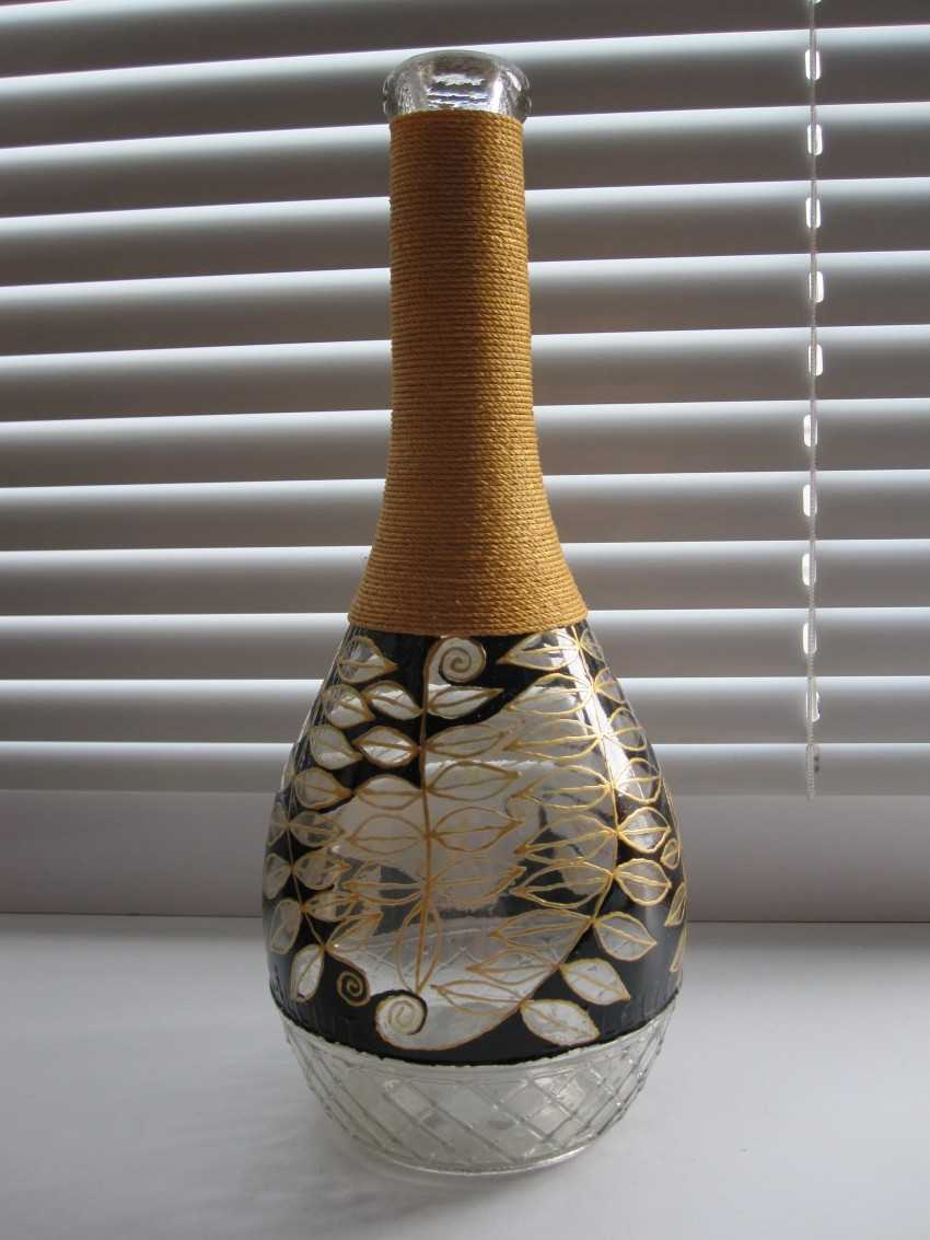 Оригинальные и необычные бутылочные вазы домашнего производства выходят при расположении шнура в виде витиеватого контура.
