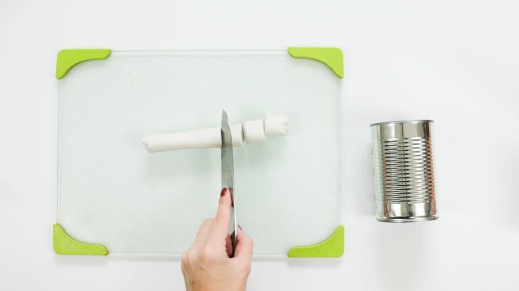 Все элементы заварного теста в процессе работы мы склеиваем клеем ПВА. Раскатайте скалкой зеленое тесто. Круглой баночкой вырежьте круг диаметром 12 см. Это будет подставка для карандашницы. Толщина подставки 5-6 см.