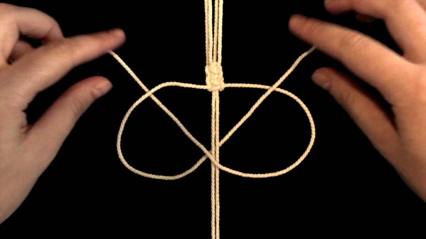 - Плетение начинается с левой стороны, когда нить укладывается сверху, а затем её оплетает правая. При этом она пропускается под короткими концами, и выходит между левой короткой и длиной.