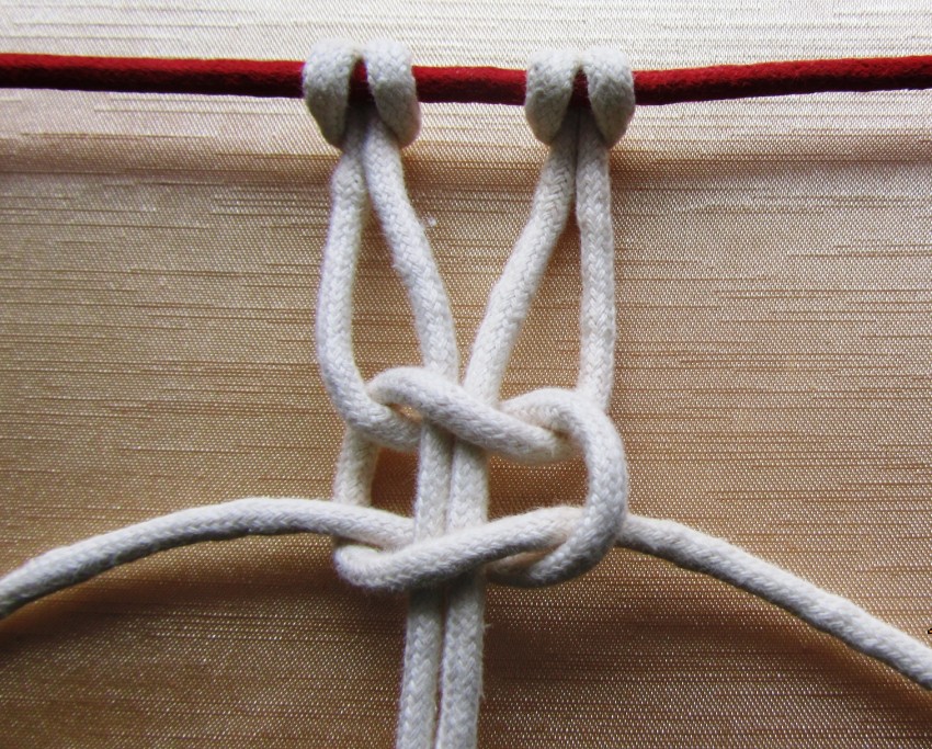 - Опустите на один уровень с двумя рабочими нитями, длинную часть нити находящуюся за узлом. Завяжите из этих трех шнуров квадратный узел.