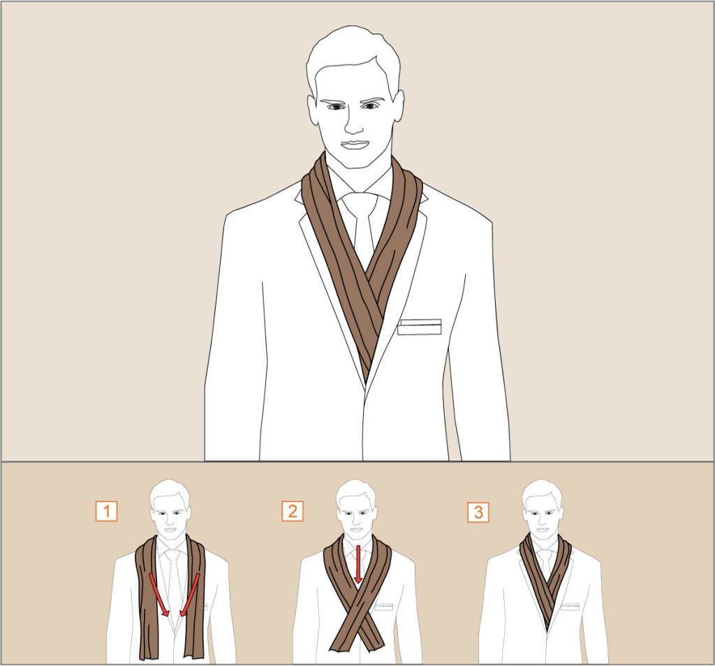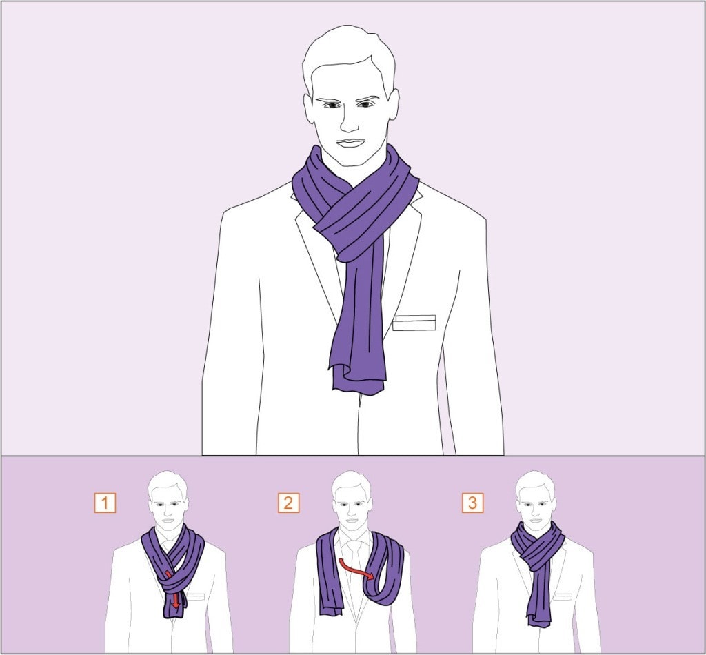 Один из простых способов, как завязать шарф мужчине. К шарфу нет особых требований, подойдет любой среднестатистический шарф. Отлично подходит для холодной зимы, т.к. не остается зазоров, куда может проникнуть холодный воздух.