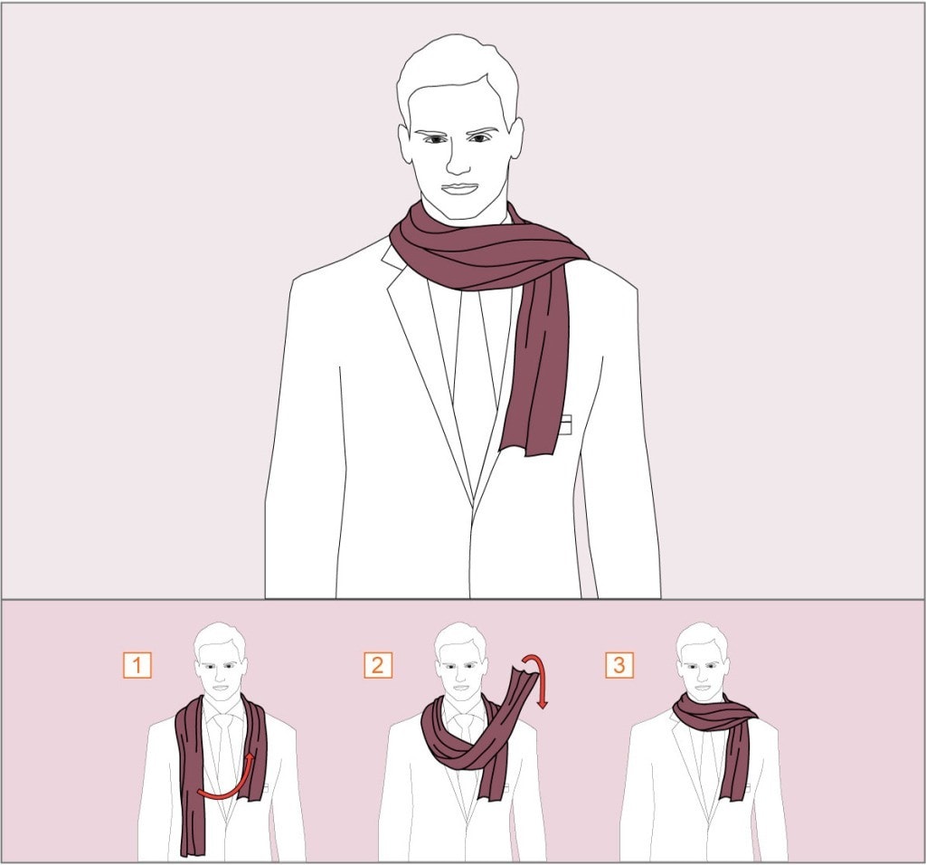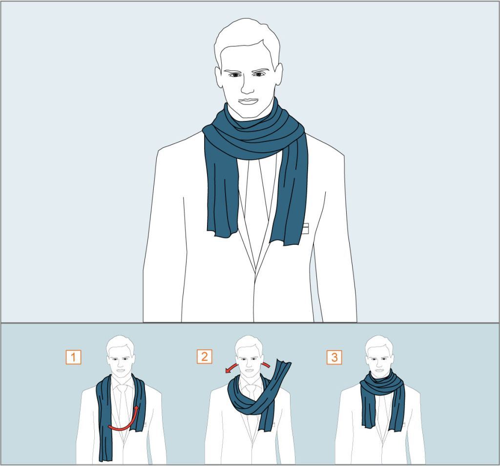Как завязать шарф: просто накиньте шарф на шею и, при необходимости, заправьте концы во внутрь пиджака вдоль линии лацканов пиджака.