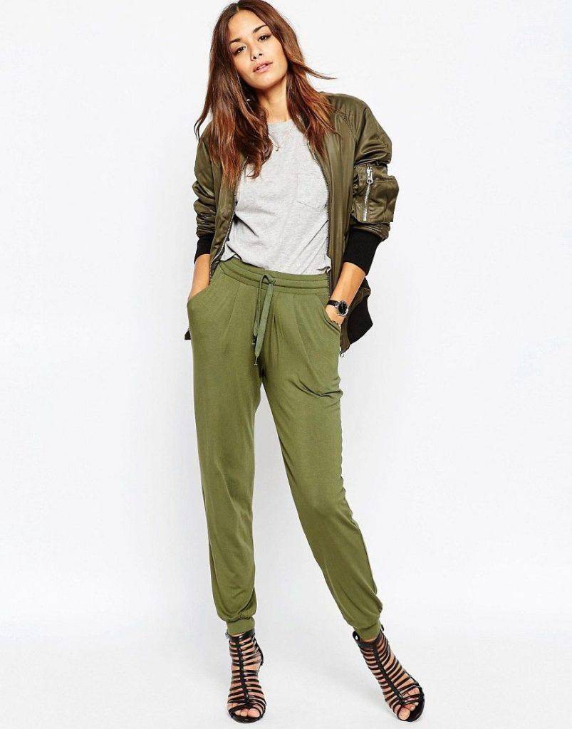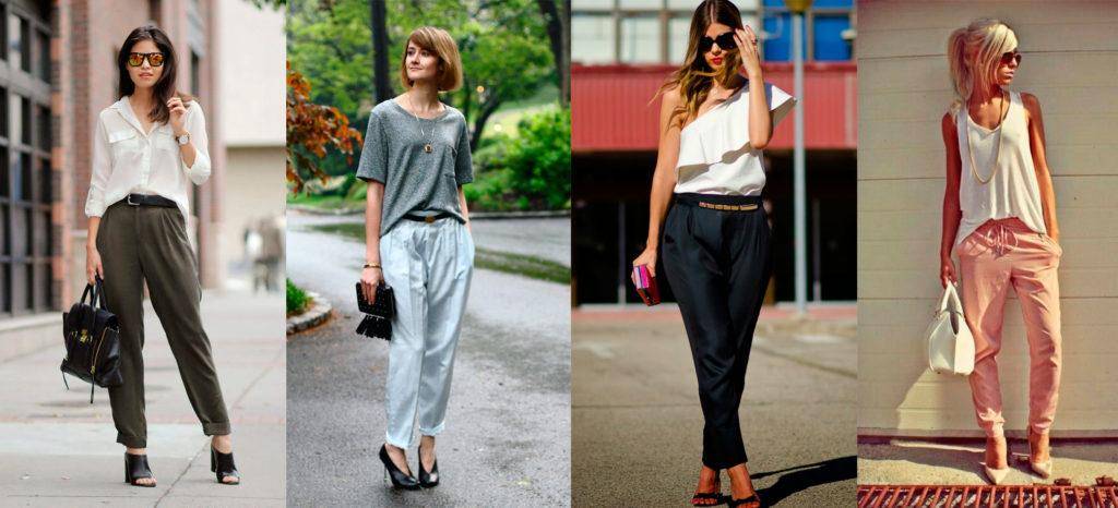 Напряженный темп жизни городских женщин вносит свои коррективы в их гардероб. С развитием уличной моды на смену классическим костюмам пришла удобная одежда. Однотонные штаны в сочетании с футболкой или майкой, дополненные кроссовками — вариант для повседневного лука.