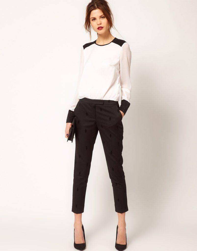 Для офиса, где нет строгого дресс-кода, подходит костюм, который состоит из черных или серых брюк прямого кроя со стрелками, белой блузки с коротким рукавом и воротником-стойкой, пиджаком под цвет низа.