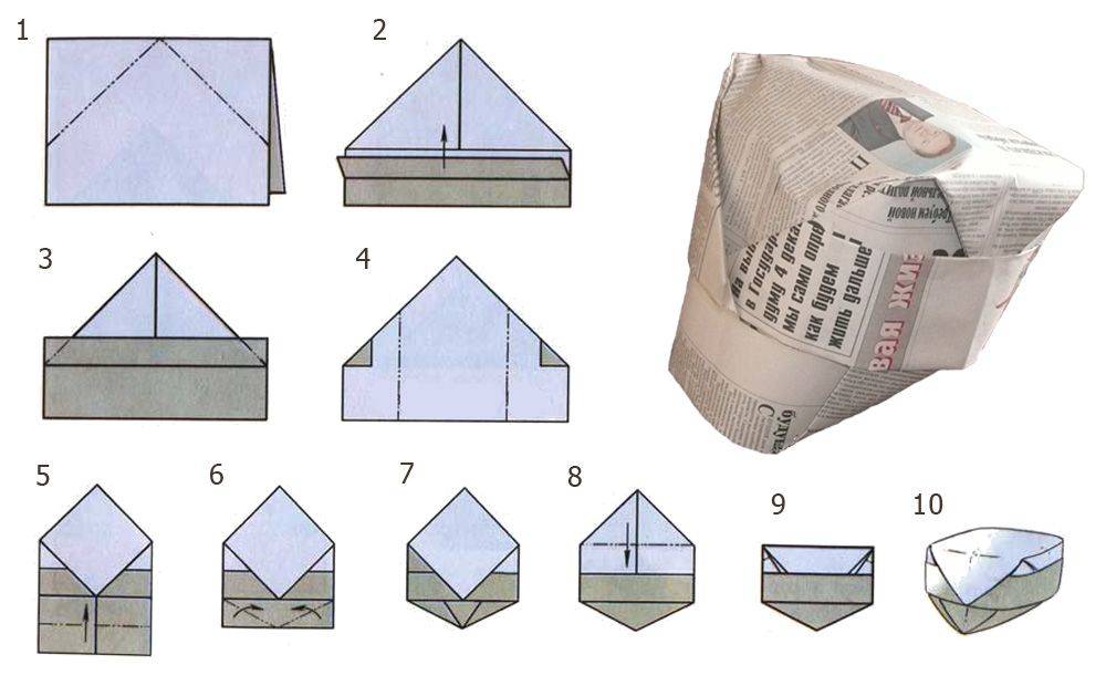 Схема как складывать газетный лист. Схема понятная и позволяет регулировать окружность пилотки.