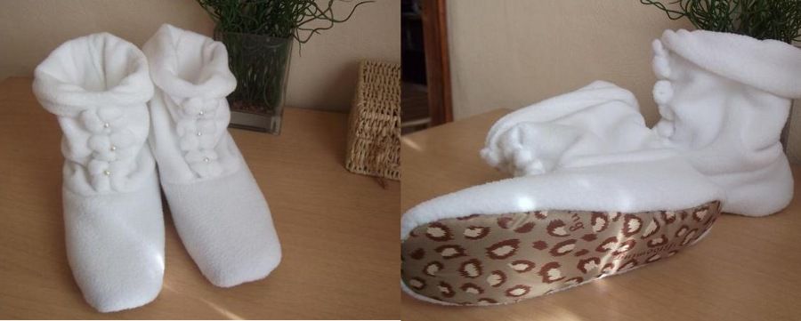 Домашняя обувь-сапожки, тоже сделана своими руками в домашних условиях. Она очень актуальна для людей, кто постоянно мерзнет или имеет проблемы с суставами.