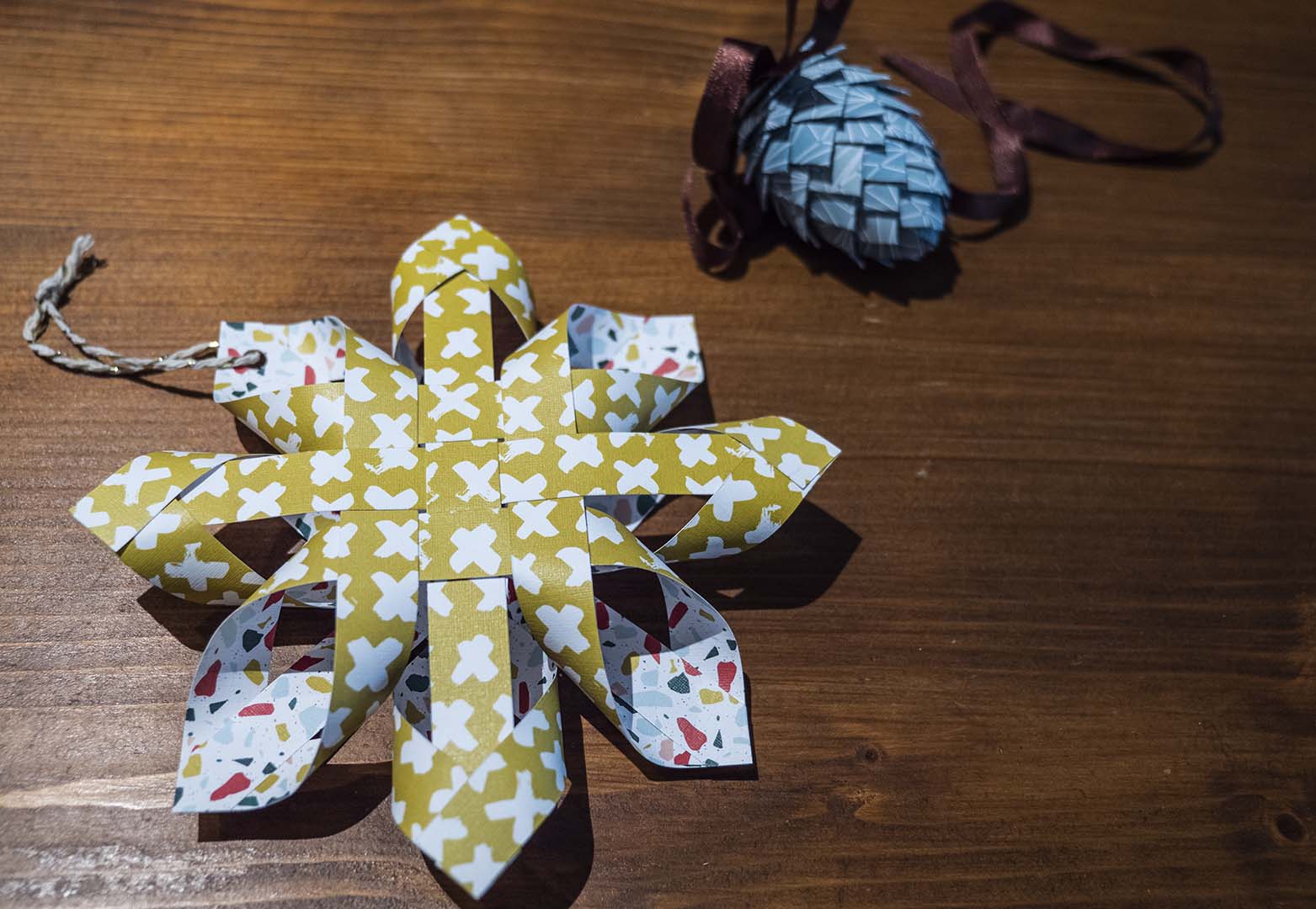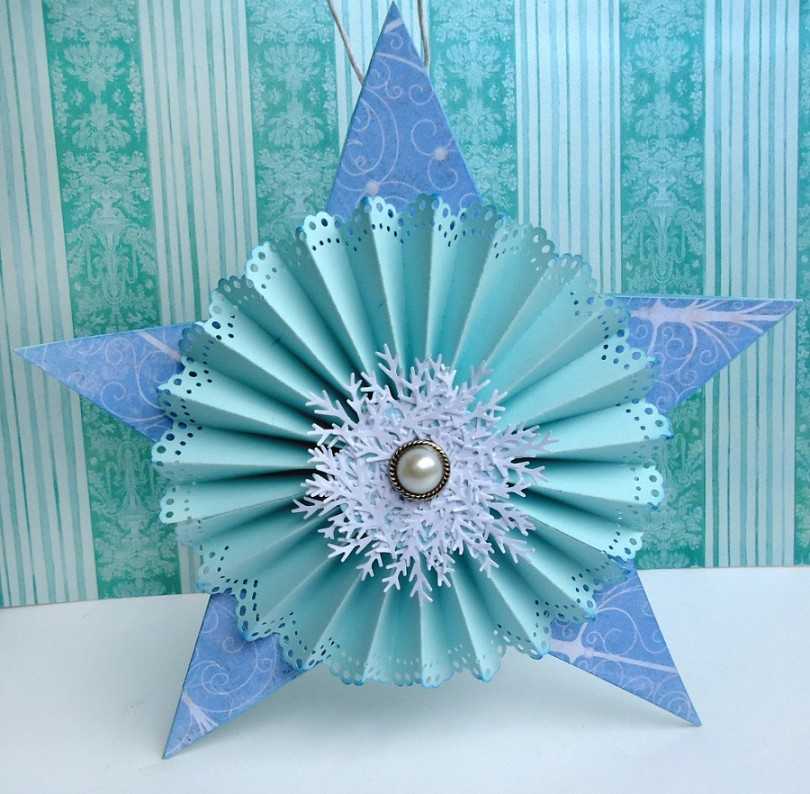 Таким же образом выполняется вторая заготовка. Теперь остается лишь соединить две половинки рождественской звезды между собой под углом 45 градусов при помощи клея. Новогодняя поделка готова, нужно лишь прикрепить к верхушке ленточку, чтобы можно было подвесить игрушку на елку.