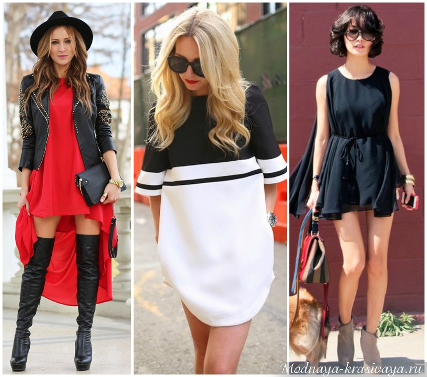 Трапециевидное – визуально удлиняет силуэт, делая его утонченным. Такой крой помогает скрыть широкие бедра. Некоторые изделия дополняют асимметричным низом – они укорочены спереди и удлинены сзади. Фасоны подходят девушкам с красивыми ногами.