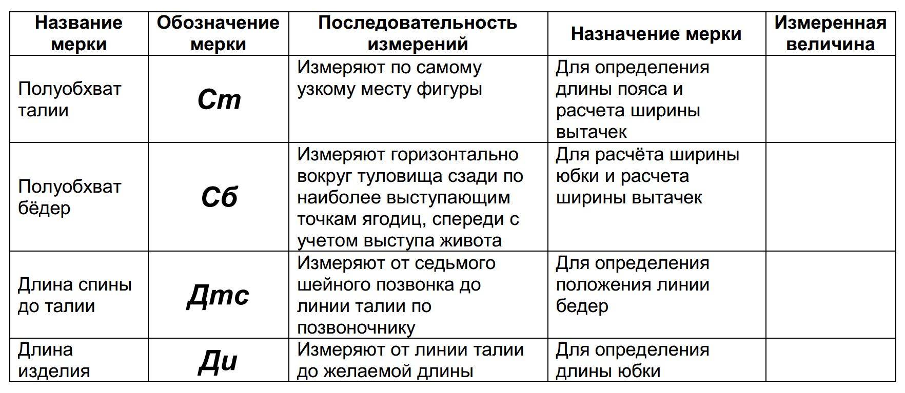Крой юбки с силуэтом А отрезается от кроя прямой юбки, для чего снимаются следующие мерки: