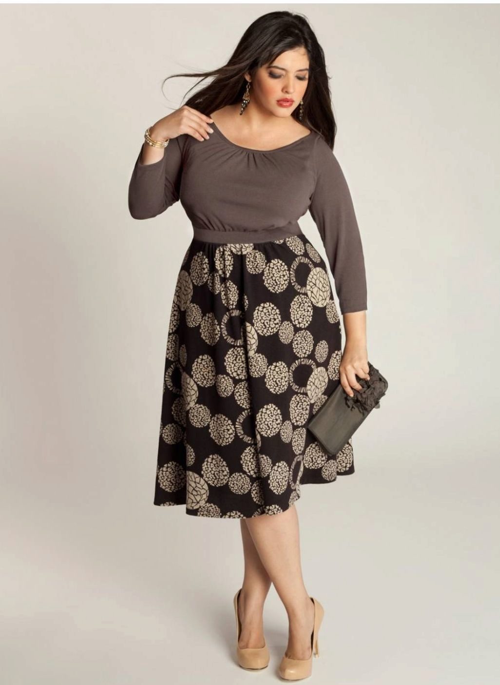 Женщинам с любой фигурой и разного возраста подходит длина до колена. Расклешенные юбки носят с тонким и широким каблуком, сапогами, ботильонами. Их надевают на вечеринку и официальное мероприятие.