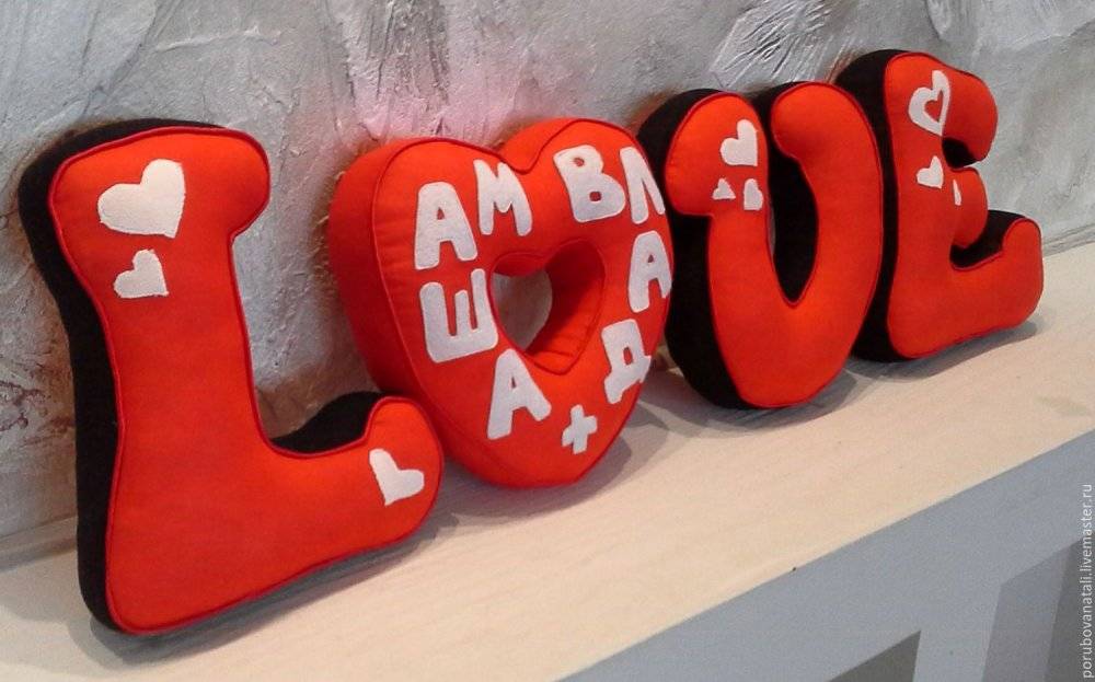 Казалось бы, буквам-подушкам место в детской, ан нет. Смотря, в какое слово эти подушки складываются. Один из самых востребованных вариантов – слово «love», которое с удовольствием приобретают молодые пары в подарок на годовщины или День всех влюбленных. Такая подушка будет уместна и в спальне, и на полке над кроватью, и на спинке дивана в гостиной. Помимо своей символичности и практичности в чисто бытовом плане, такая подушка может быть оригинальным дополнением для фото.