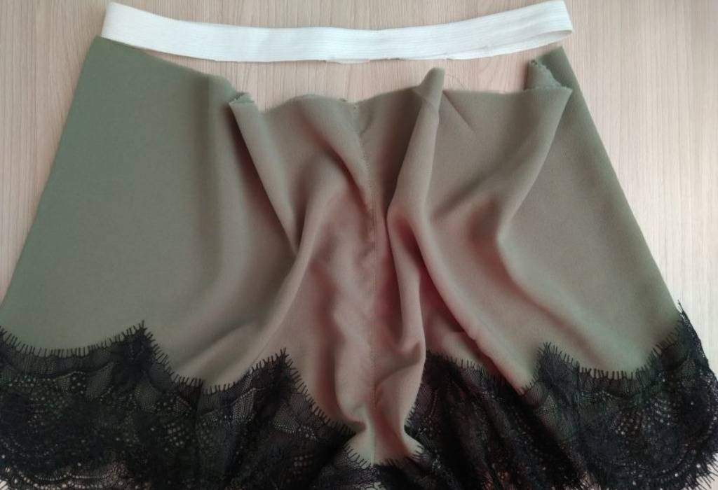 - Шов нужно будет отутюжить, а кружева прикрепить на лицевую часть ткани, после чего пристрочить.