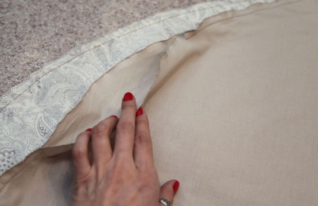 Выполняем по контуру наволочки и наперника машинный шов, оставив открытые участки на центральных частях дуг. Обмётываем края припуска.