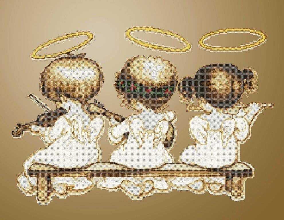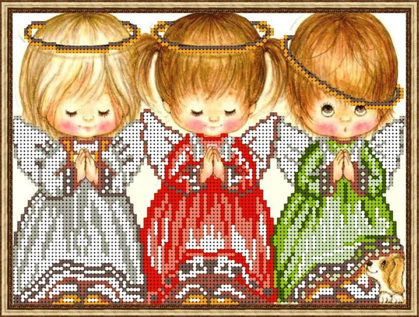 Данная схема весьма популярна у женщин, которые хотят завести детей. Есть примета, что окончание такой вышивки обязательно ведет к беременности. Сюжет картины: три молящихся ангелочка, склонившие свои головки в молитве, кроме одного.