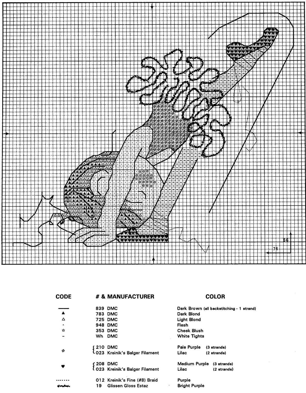 Не забудьте вставить полотно в пяльцы. работать с пяльцами гораздо легче, и вы избежите деформации вышивки. Не забывайте сверяться с цветовой гаммой ключа, чтобы не перепутать оттенки. Вышейте крестом ногу балерины, начиная с темных оттенков ниток, и продолжая светлыми.
