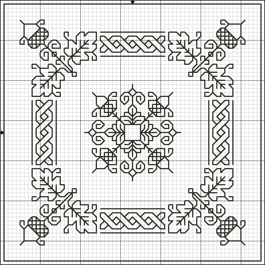 Первым этапом нужно определиться с узором. Как правило, выбирают геометрические фигуры или же орнаменты из народных мотивов. Может выполняться целостной вышивкой крестиком или же заполнение квадратиков может быть частичным. То есть, в центре квадрата есть центральная фигура и от неё исходят мелкие элементы.