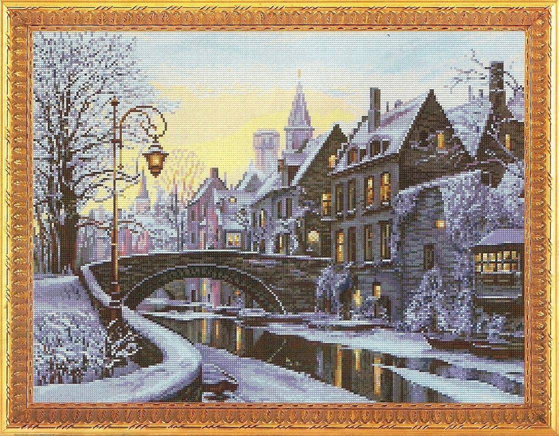 Зимний пейзаж выполняется различными цветовыми вариантами, в том числе зеленым, коричневым, любыми оттенками желтого, оранжевого и алого, для создания великолепного заката, но основным окрасом являются синие и голубые оттенки. В процессе используется полный крест, и техника соответствует описанной ранее.