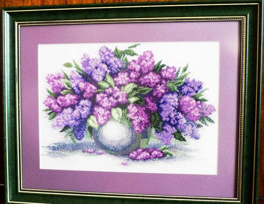 - соцветия сирени сложны по своей структуре, что играет на руку не очень внимательным рукодельницам. Если в ходе набора счетного креста будут допущены некоторые неточности, в готовой работе этого видно не будет за счет сложной формы букета сирени;