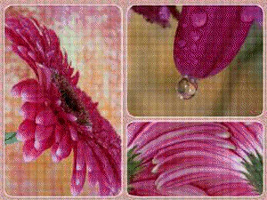 Приведем для вас один пример схемы для вышивки триптиха, на которой изображены цветы Герберы. Это не обычная схема, и главное ее отличие именно в том, как расположены три составные вышитой картины. Здесь основная ее часть находится не в центре экспозиции, а слева. На ней изображен цветок Герберы целиком. Два составляющих триптих элемента картины находятся с правой стороны, один над другим. В классическом варианте триптихи имеют две второстепенные половинки, которые не отличаются по размеру. Но в том варианте схемы, который мы рассматриваем, эти дополнительные картины имеют разный размер. Верхняя часть представляет собой квадрат, а нижняя прямоугольник, меньшей площадью. Очень красивая схема, где на лепестках Герберы вы видите прозрачные капельки росы. Основной цвет картины розовый и бардовый. Такой триптих будет очень органично выглядеть как в жилом помещении, так и в любом офисе.