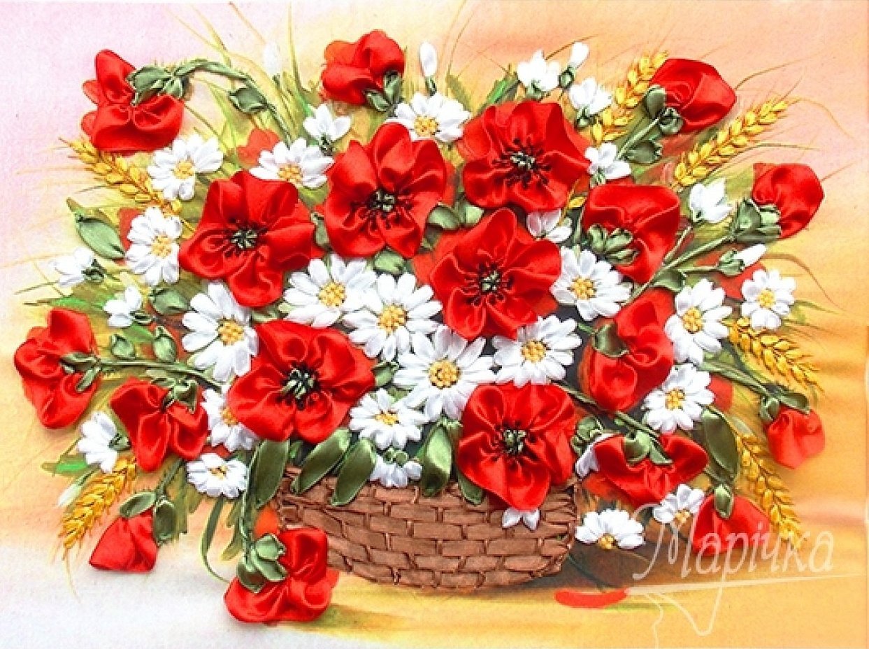 Нежные полевые ромашки будут шикарно выглядеть в букете с красными маками. Чтобы сделать маки похожими на настоящие, потребуется широкая (5 см) красная лента, немного такой же зеленой, черные и красные нитки. На ткани нужно обозначить расположение цветов и бутонов, начертить подходящих размеров корзину (рис. 2).