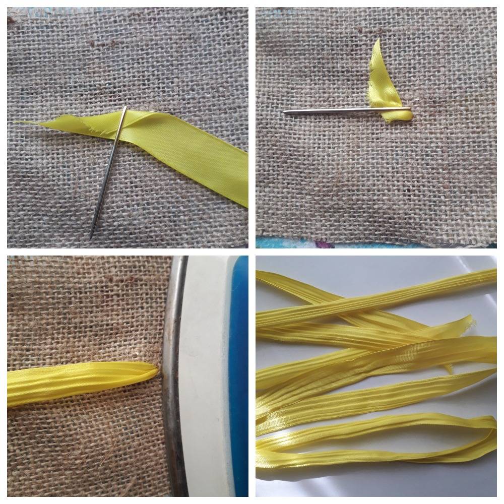 Для вышивки лепестков понадобятся узкие атласные лены двух желтых оттенков.