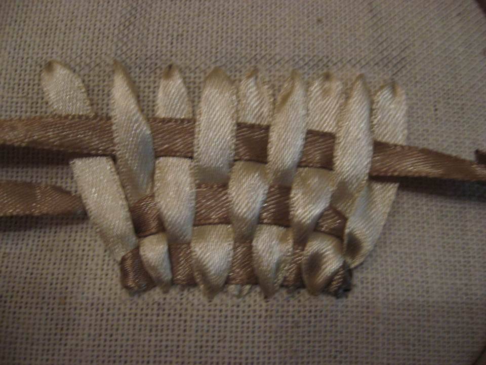 - Начинаем чередовать пошив. На первый луч ленту мы накладываем, на втором луче её нужно пропустить под ним. Продолжаем чередование, после каждого нижнего луча ленту подтягиваем и слегка подкручиваем.