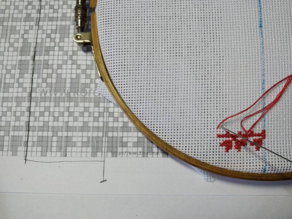 Перед вышивкой выполняется разметка на ткани 10х10 для удобства. Вышивка выполняется в две нити сверху вниз. Нельзя оставлять узлы, края нити закрываются стежками (крестами). Нить закрепляется на лицевой стороне, стежки могут быть вертикальными или горизонтальными. Схема следующая: сначала выполняется нужное количество диагональных стежков в одну сторону, а затем аналогично двигаемся в обратном направлении