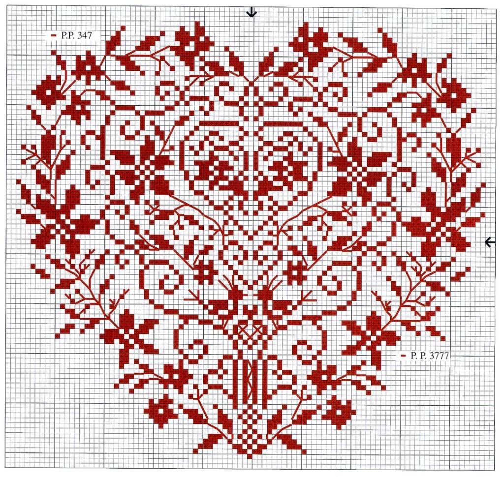 Отличным украшением для кухни будет вышивка на вафельных полотенцах. Такой подарок сумеет порадовать любую хозяйку. Если вы хотите изобразить что-то многоцветное с большим количеством деталей, то лучше использовать водорастворимую канву. Но если вы подберете узор попроще, то вполне легко будет вышивать прямо по ячейкам такого полотенца. Например, вот такие сердечки. Для отшива такой схемы потребуется всего два цвета ниток. Красный и розовый. Центр схемы обозначен черной стрелочкой. Неплохо смотрятся на вафельных полотенцах всевозможные орнаменты и узоры. Они могут вышиваться одним или двумя цветами.