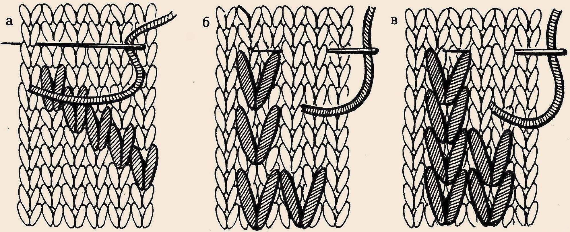 Вышивание на вязаном изделии по вертикальному ряду с лицевой стороны