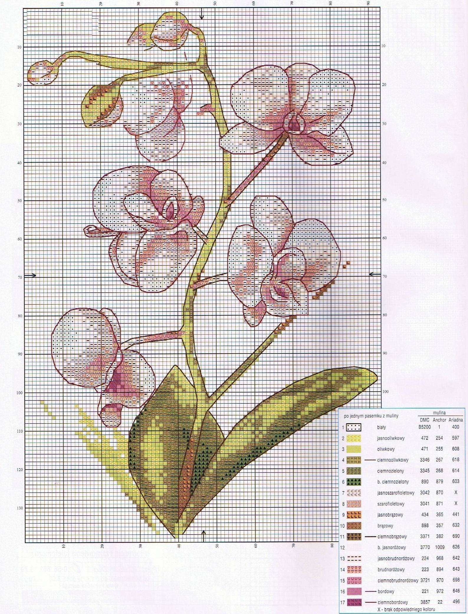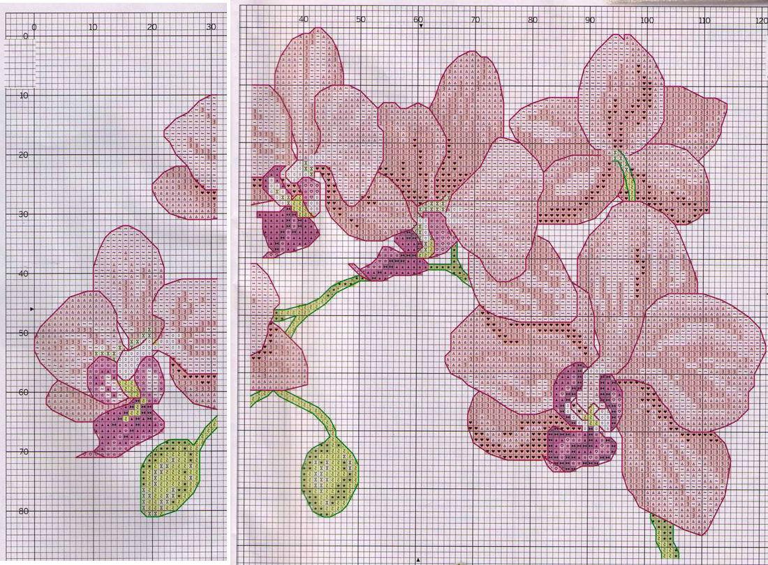 Следующая схема изображает ветку розовой орхидеи. Это настоящее произведение искусства. Цветок так прекрасен, что невозможно оторвать взгляд. начать работу можно из центра или из любого угла канвы, кому как удобно.