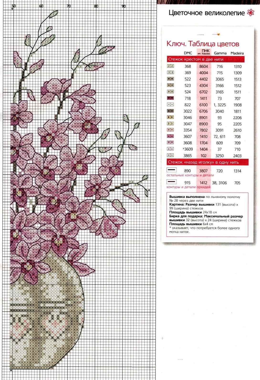 Еще одна картина изображает целый букет орхидей, стоящих в вазе. Соцветия напоминают крылья бабочек, застывших в полете. Стежки в технике креста выполняют в два сложения мулине. Проще всего начинать вышивание не с цветов, а с вазы, так как сами бутоны оформлять утомительно. Основная трудность заключается в вышивке центральной части цветочка, потому что в нем присутствует множество оттенков розового. Обязательно во время рабочего процесса вам необходимо постоянно сверяться со схемой. Отмечайте маркером те места, которые уже вышили. Так вы быстрее сориентируетесь и найдете тот сектор, который еще не затронут иголкой с ниткой.
