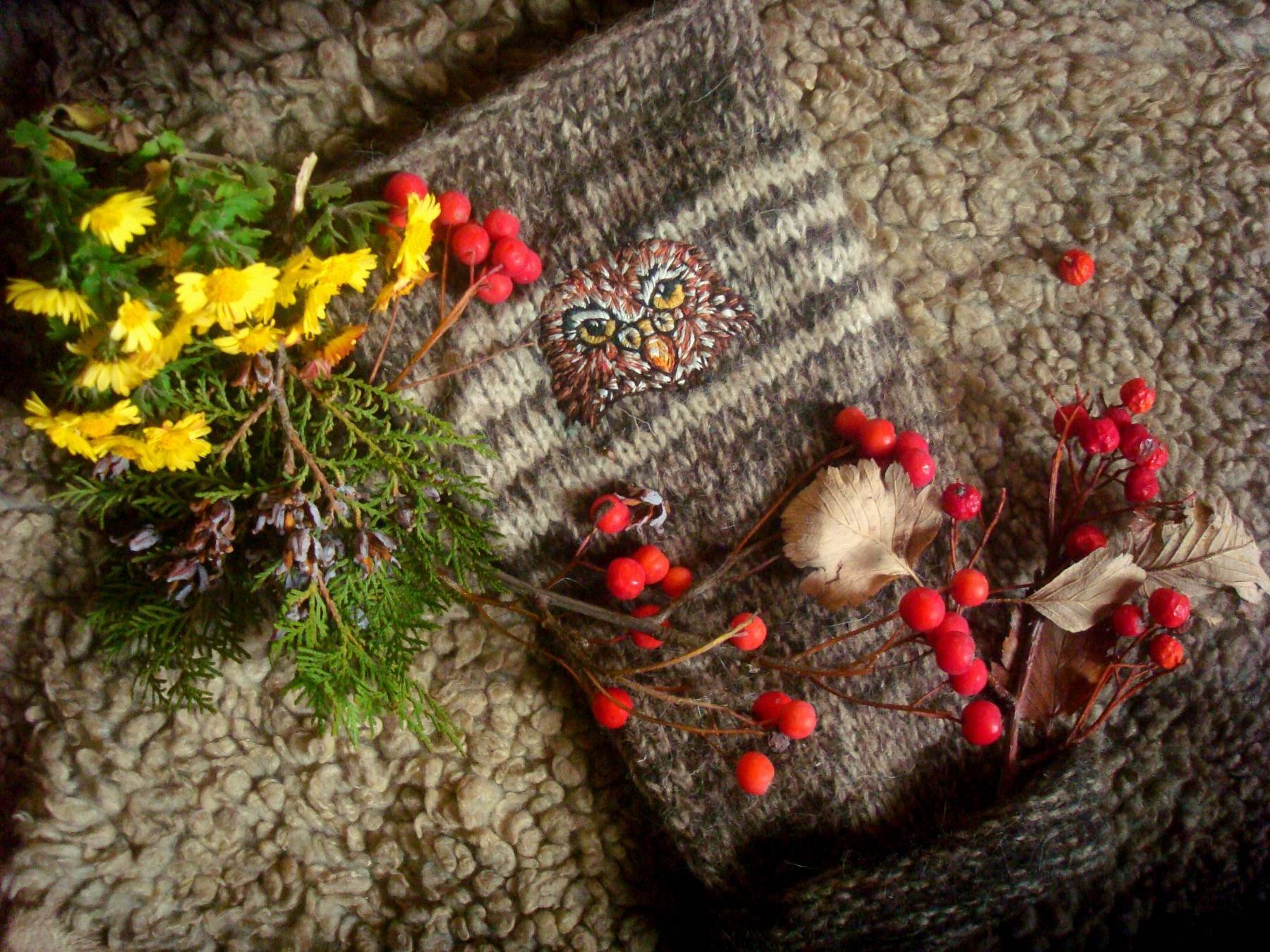 В данном мастер-классе выбран нестандартный прием для вышивки на вязаном полотне из натуральной шерсти. Полотно имеет достаточно плотную структуру вязки и значительную толщину, но вышивка будет выполняться хлопковыми нитками мулине и шелковыми нитями в 2 сложения. Нити можно закреплять как узелком, так и методом крепления через стежок.