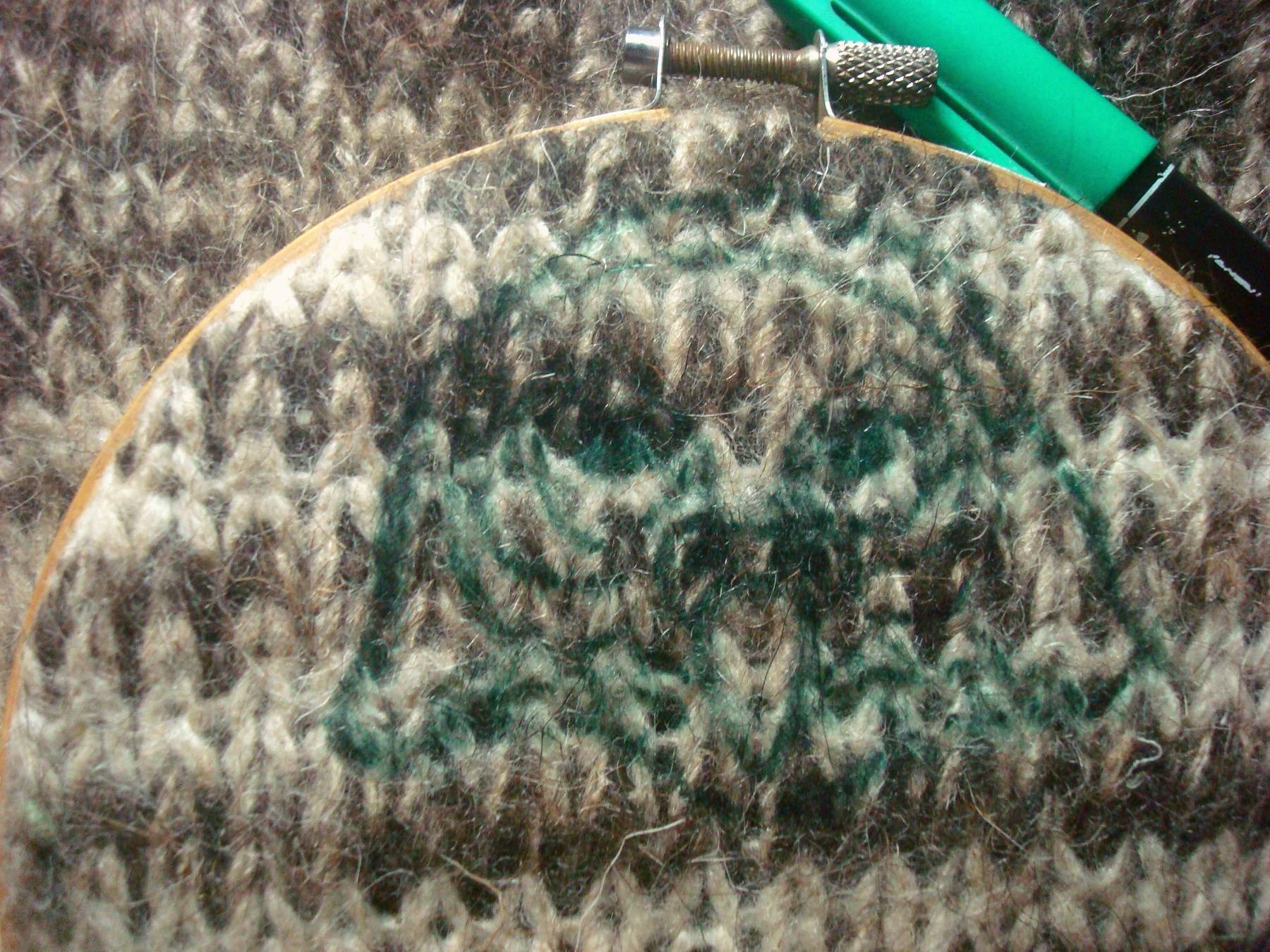Исполняется на лицевой глади. Суть в том, что провязанные петли покрываются сверху вышивкой, полностью повторяя рисунок вязки.