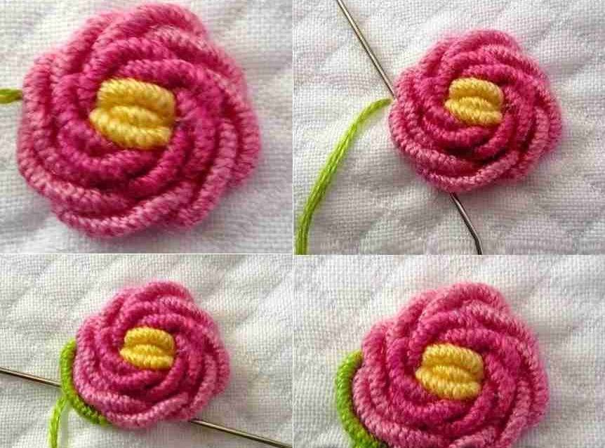 - делать розу нужно начинать с середины полотна. Изготовить три шва с семью и девятью завитками. Для такого рисунка можно использовать разные нитки, разница будет видна по завершении вышивки, и отразится она на объеме поделки;