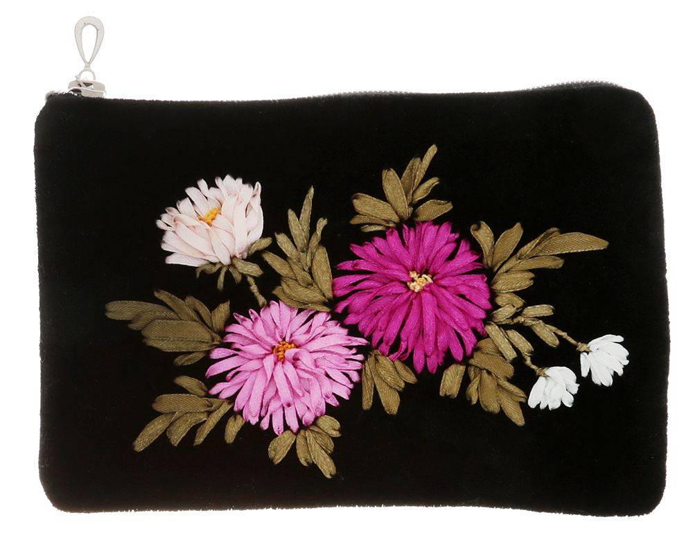 Цветочная вышивка эстетично смотрится в варианте с лентами. При создании ленточной вышивки чаще всего применяется шов петля, или узелок рококо.