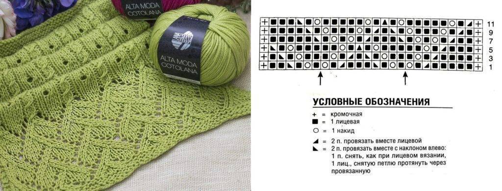 отлично подходит для вязания свитеров, кофт и кардиганов. Протяжки над снятыми петлями провязываются при смещении раппорта, что позволяет получить объемный ячеистый рисунок. Техника вязания узора представлена с описанием по схеме и видео уроком.