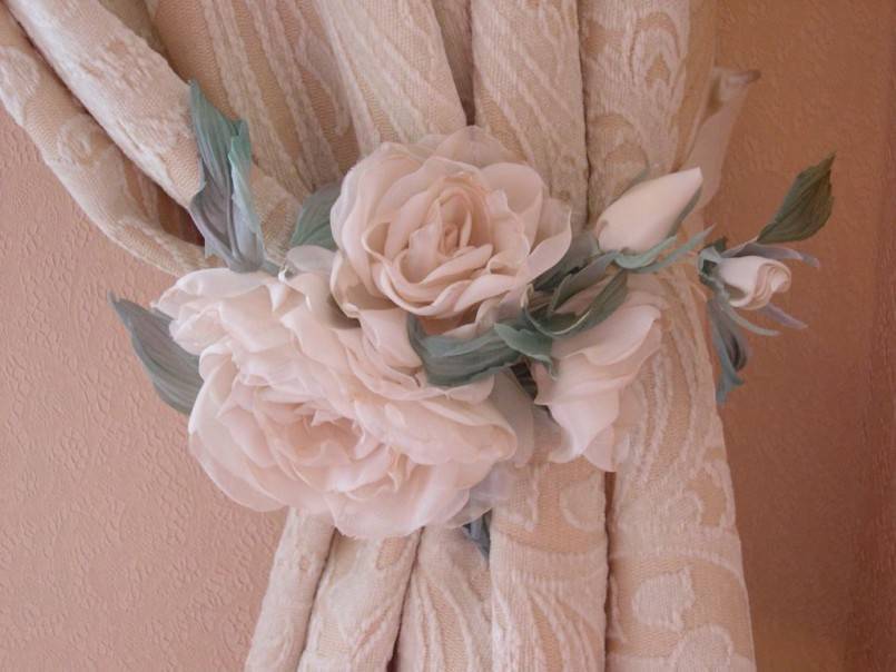 Синтетика не подойдет, только натуральные ткани. Декорировать шторы можно красивыми аксессуарами, например, заколками из крупных цветов разного цвета. Можно подобрать однотонные шторы, но они должны соответствовать общему цвету мебели.