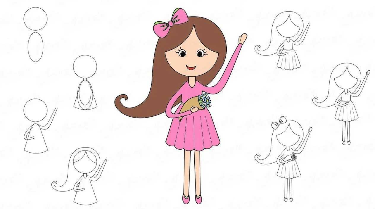 Поэтапная схема изображения озорной девочки с букетом. Внимательно рассмотрите и перенесите на полотно каждый этап.