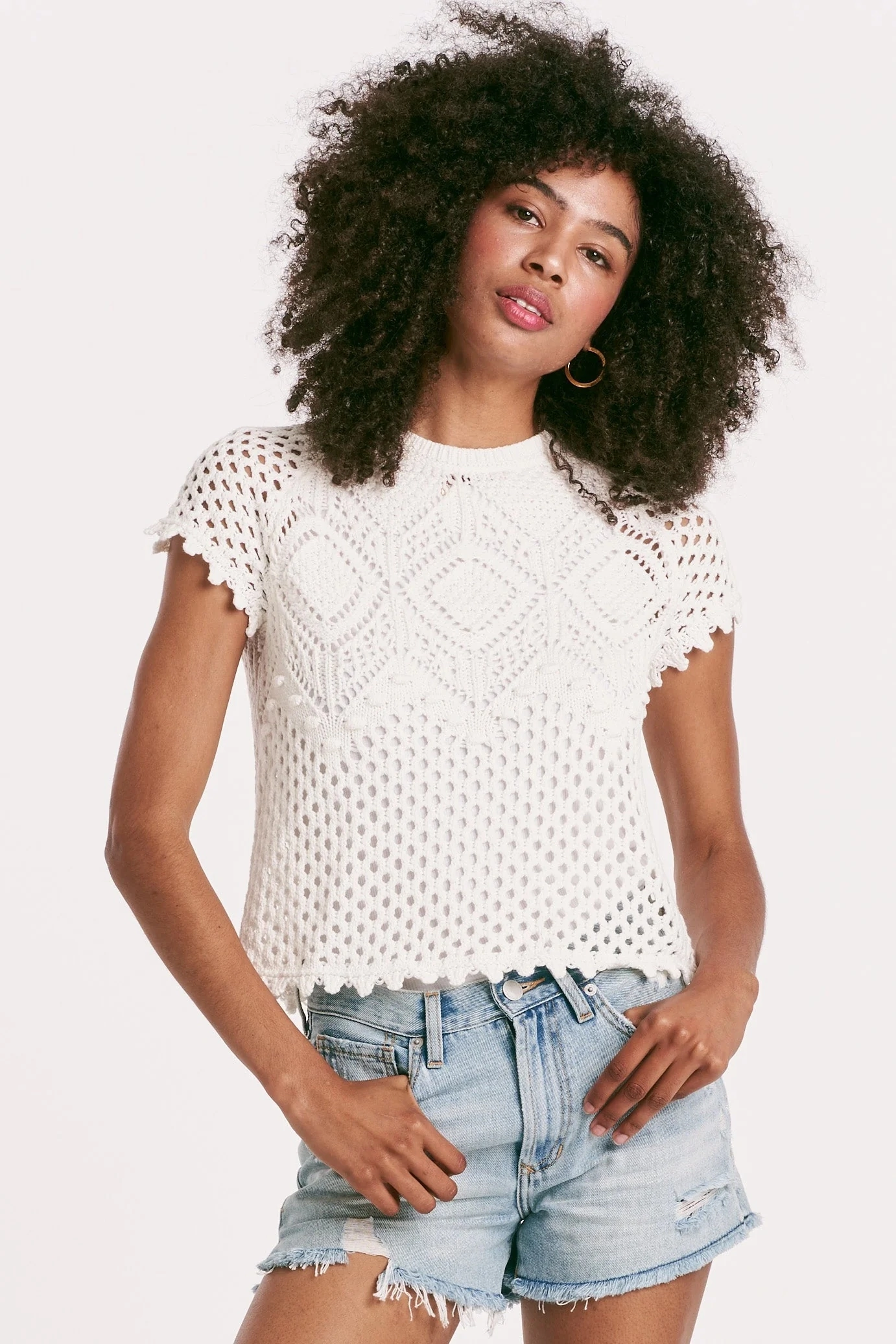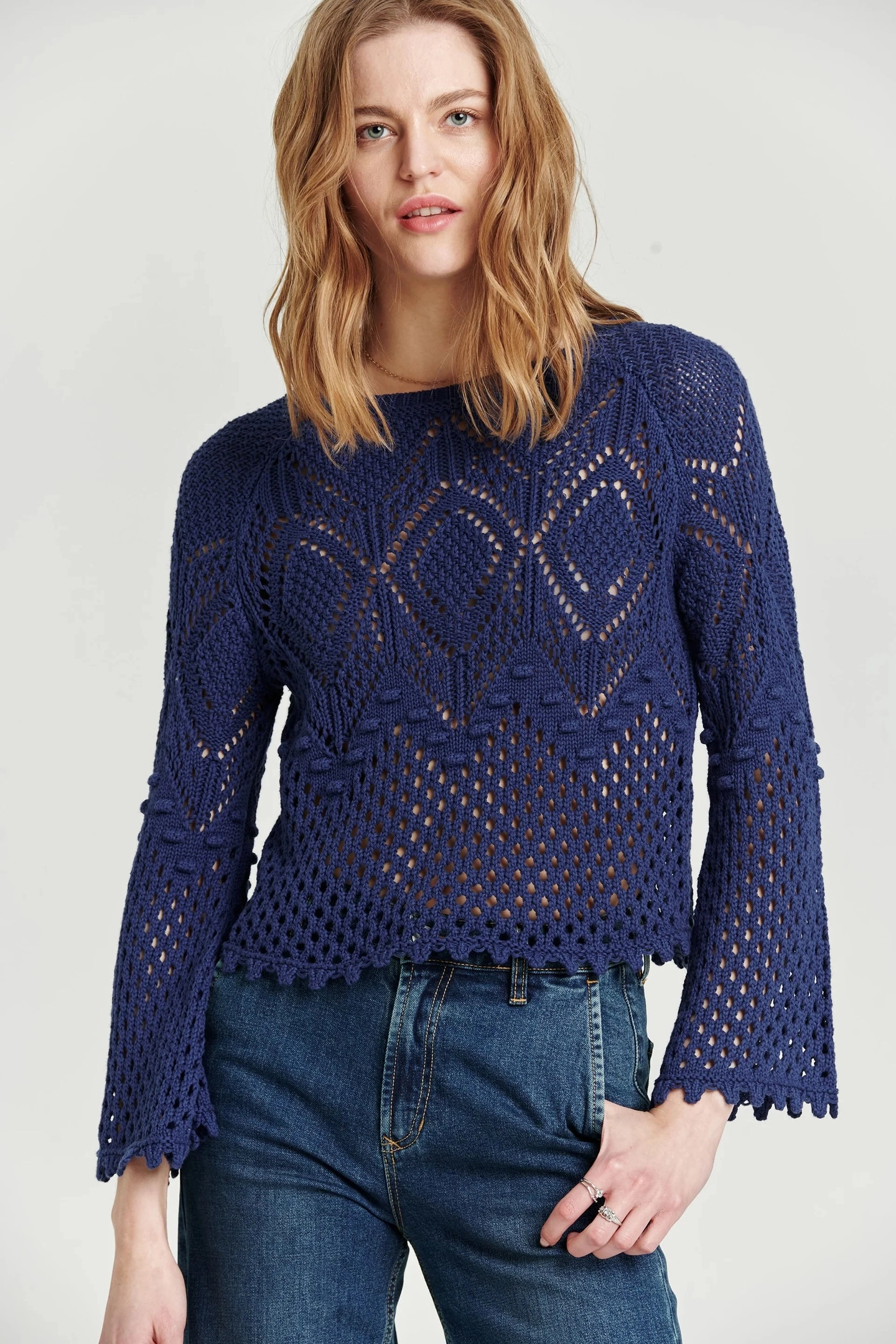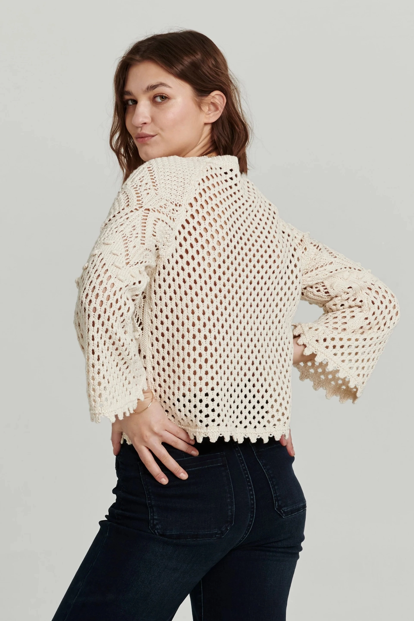 Объемный удачно сочетается с легким ажуром, образуя сказочный эффект уютного кокона, — только взгляните на этот пуловер светлого песочного оттенка!