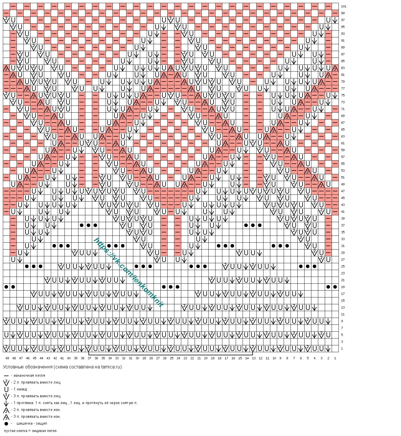 1 р. кромочная, *2 лиц., изн., накид, 2 вместе изнаночной (значок треугольником на схеме).