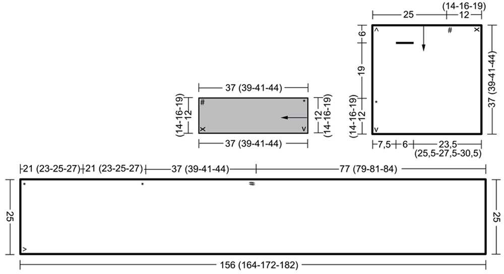 Через 72 см от наборного ряда, то есть через 74 декоративные прибавки, содержащие в себе 159 петель продолжать работу нужно в следующей последовательности: кромка, три петли платочной вязкой, одна декоративная прибавка, дал 45 петель лицевой гладью, 6 петель платочной вязкой, 23 петли лицевой гладью, три петли платочной вязкой, 23 петли лицевой гладью, 6 петель платочной вязкой, 45 петель лицевой гладью, одна декоративная прибавка, три петли платочной вязкой и кромка.