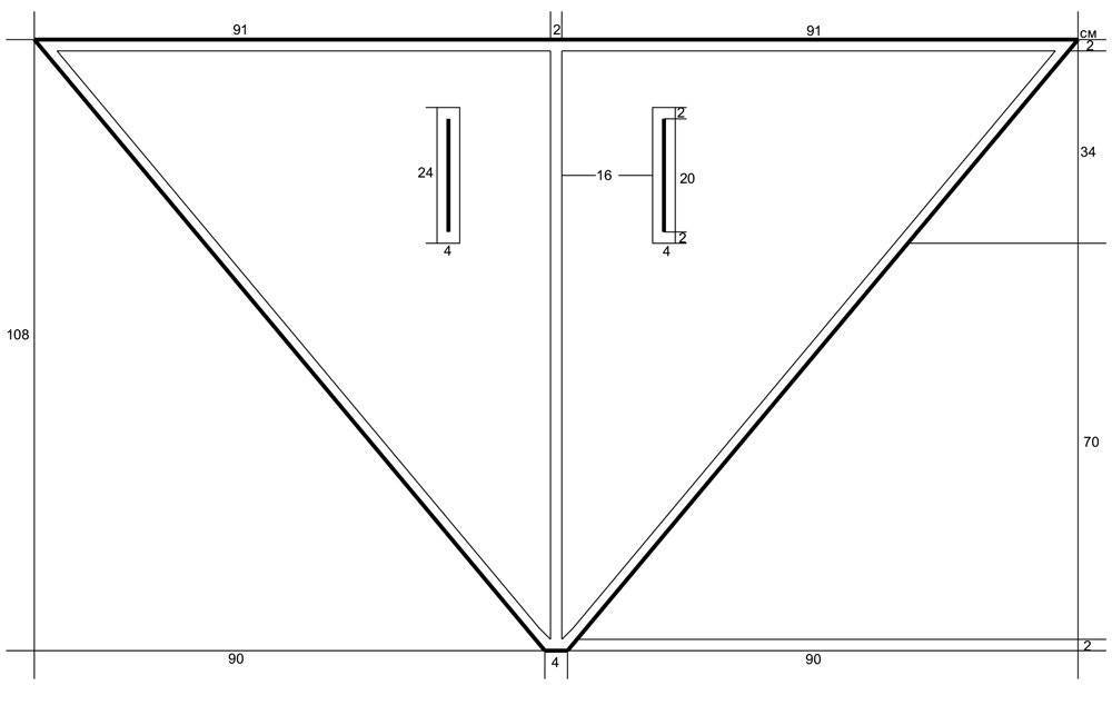 Выкройка изделия моделируется на основе прямого платья. Все построения показаны на чертеже ниже. В качестве основы можно использовать любое платье или другую вещь, подходящую по размеру.