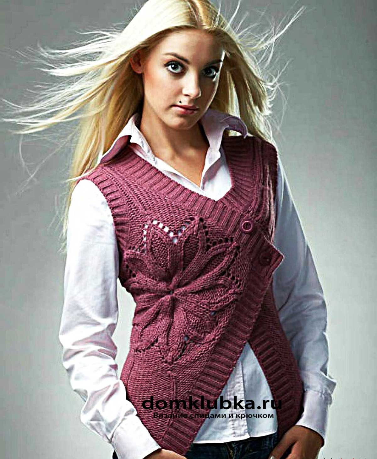 Красивые вязаные спицами женские жилеты и безрукавки могут быть похожи на строгую классику жанра, а могут быть украшены романтичными косами, аранами, цветочными мотивами, рельефными орнаментами, пуговицами, горловинами или капюшонами, ажурными окантовками.