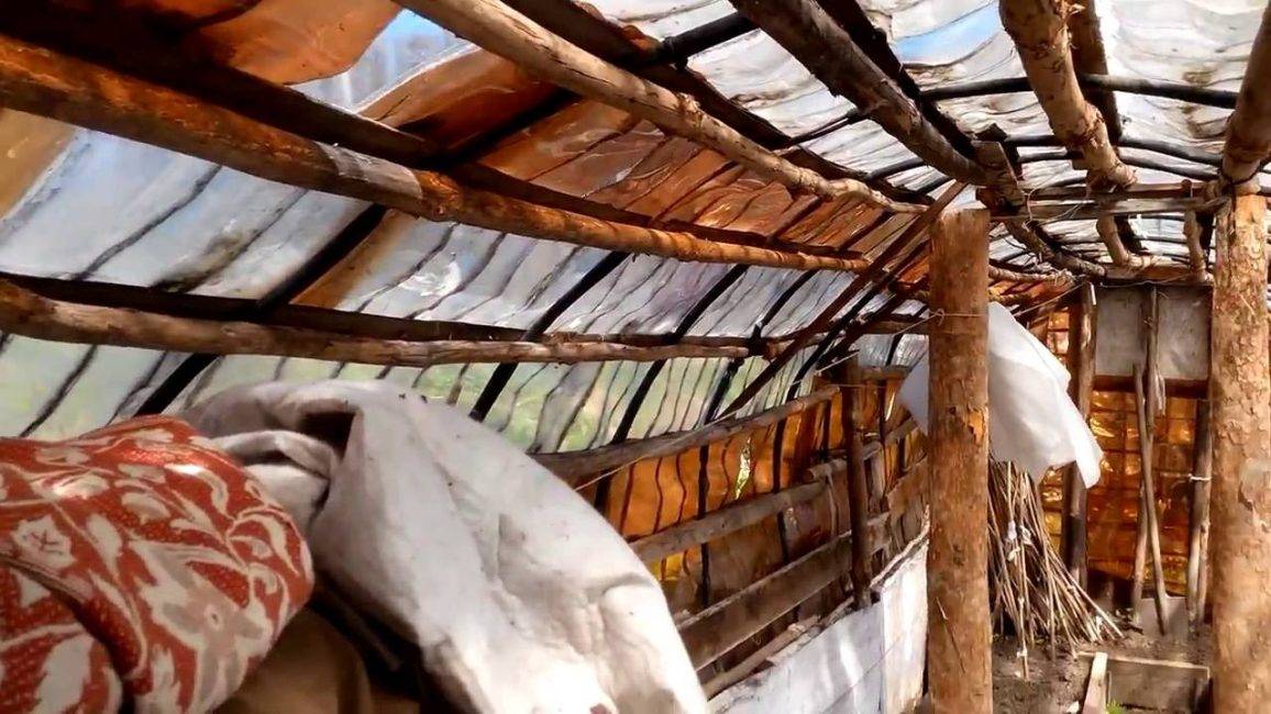 - На укрепленный прут нанизывают разрезанные коричневые пластиковые бутылки, горлышком вверх.