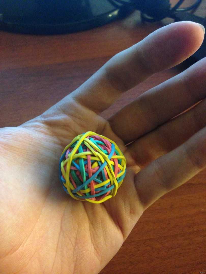 Прыгучий шарик сможет развеселить маленьких детей. Делается он за 10-15 минут. Для его создания понадобится ватный диск и достаточное количество резиночек.
