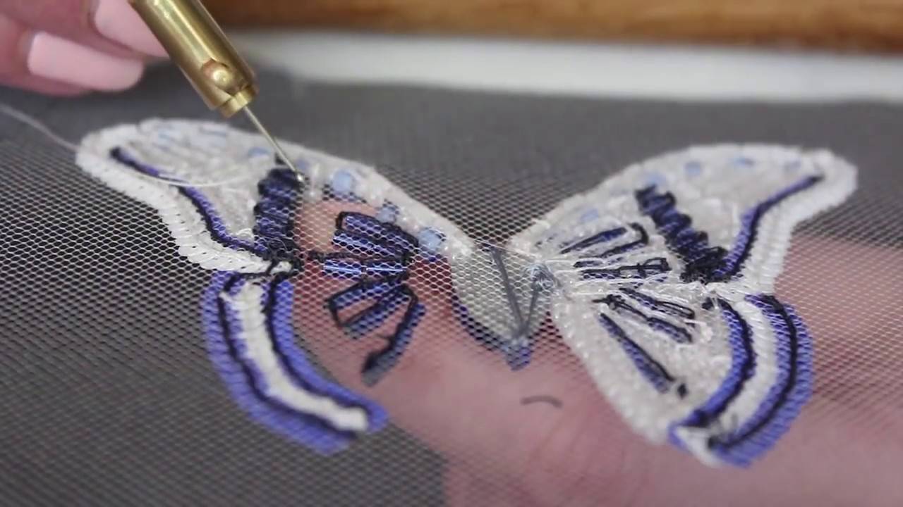 Здесь очень коротко показана работа люневильским крючком и как изящно подаются пайетки с нижней стороны ткани.